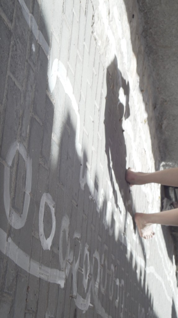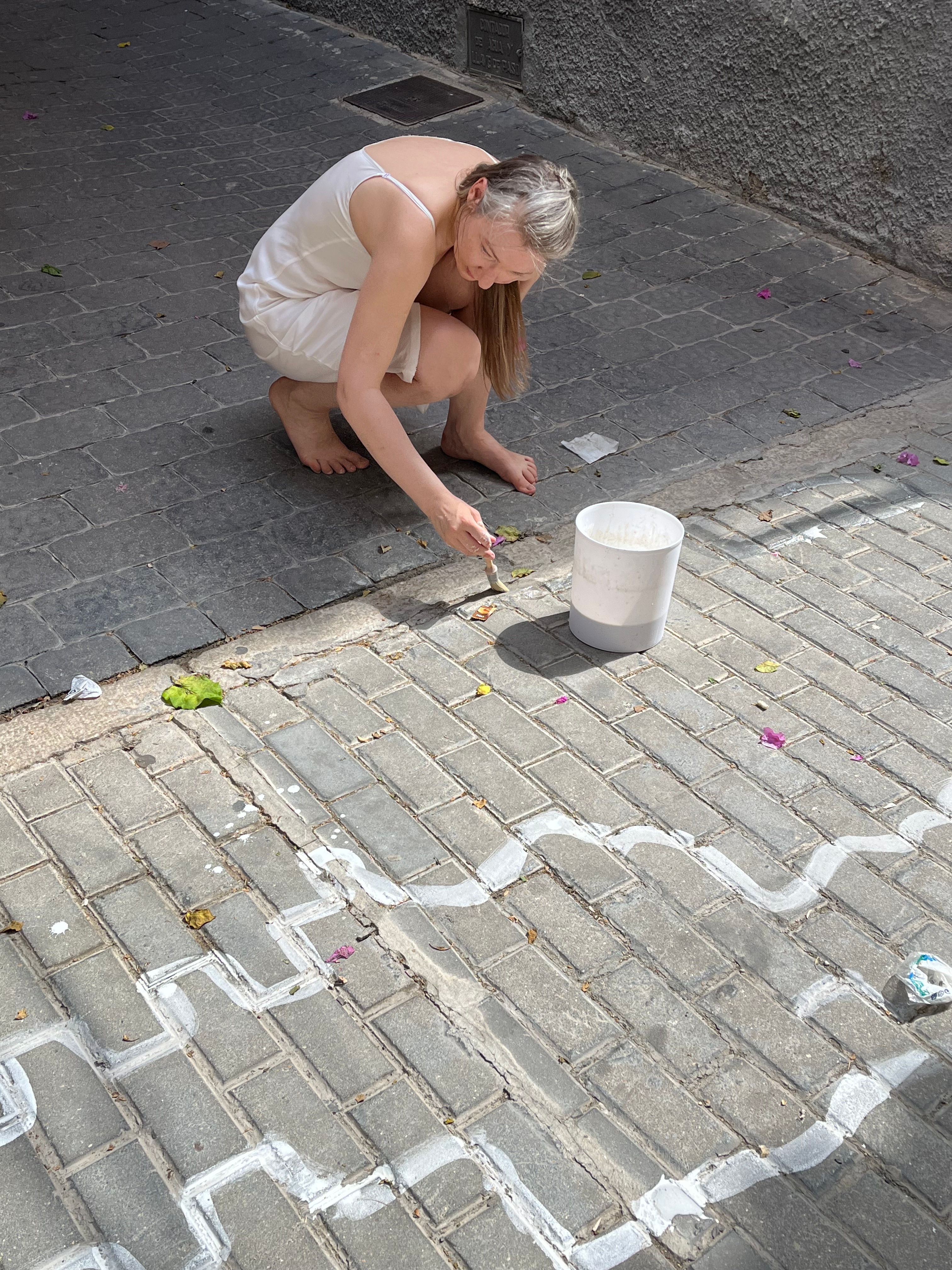 Materials: organic white paint (chalk, flour, water), brush, bucket. The line that emerges when shadow meets light.