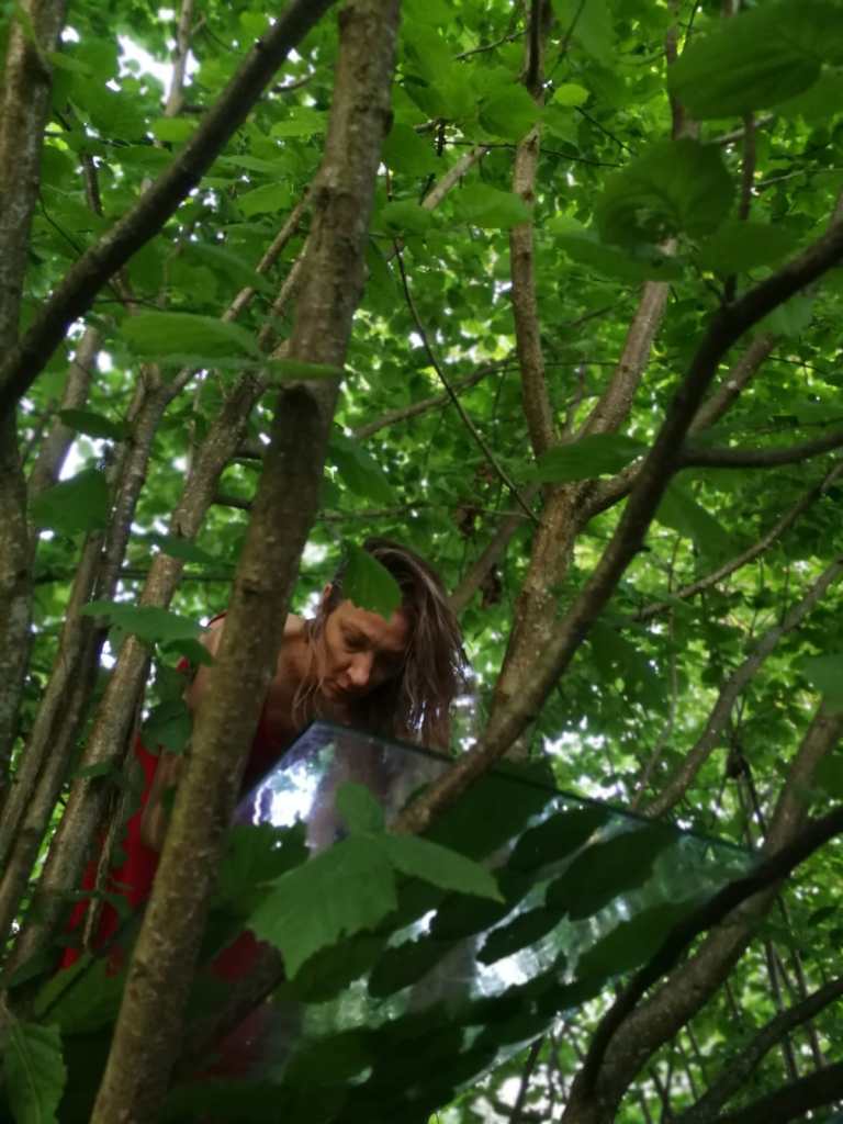 Materials: a sheet of glass, dew, hazel leaves