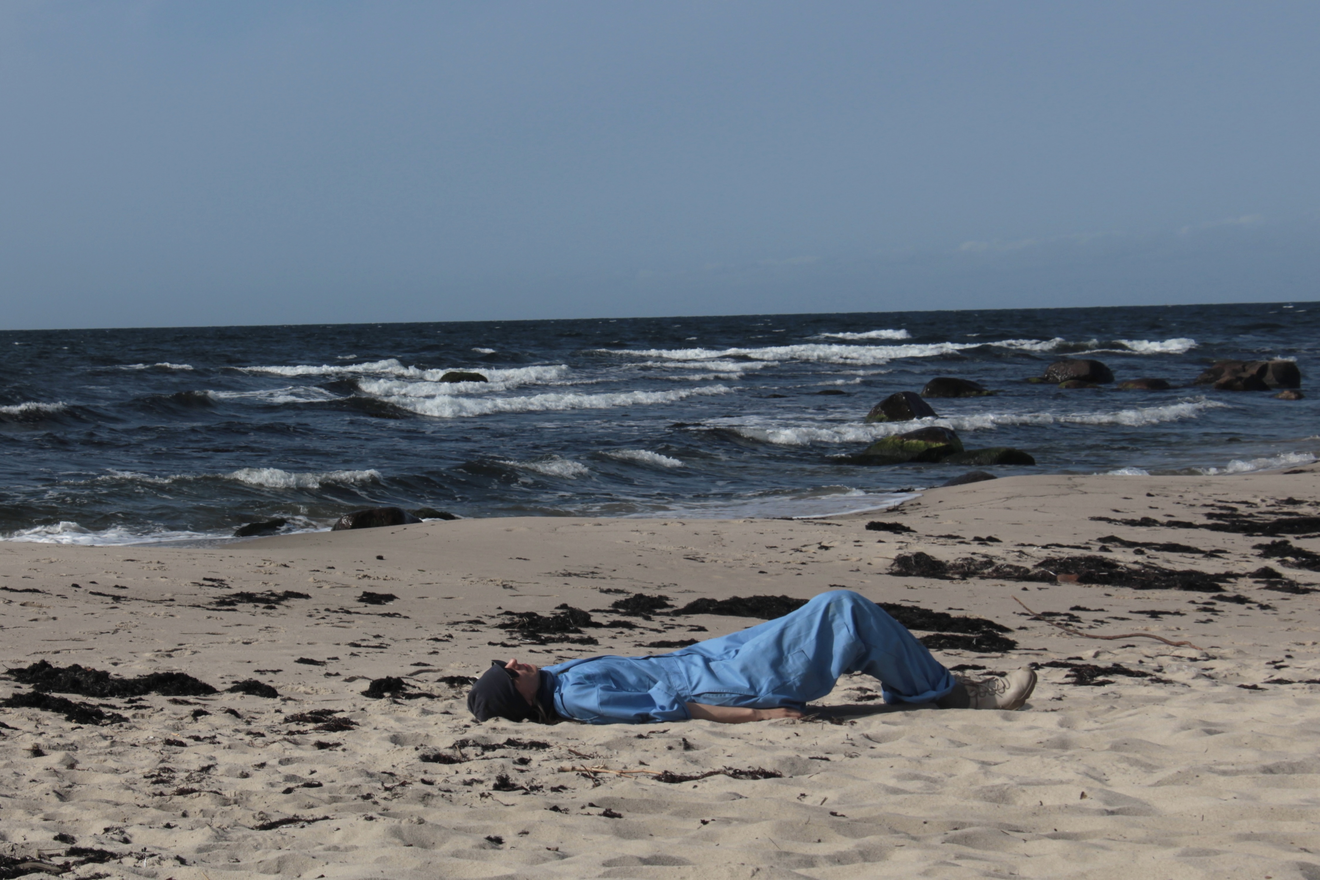 Action: I was lying on my back, looking up at the sky, slowly slipping on the sand and dreaming.