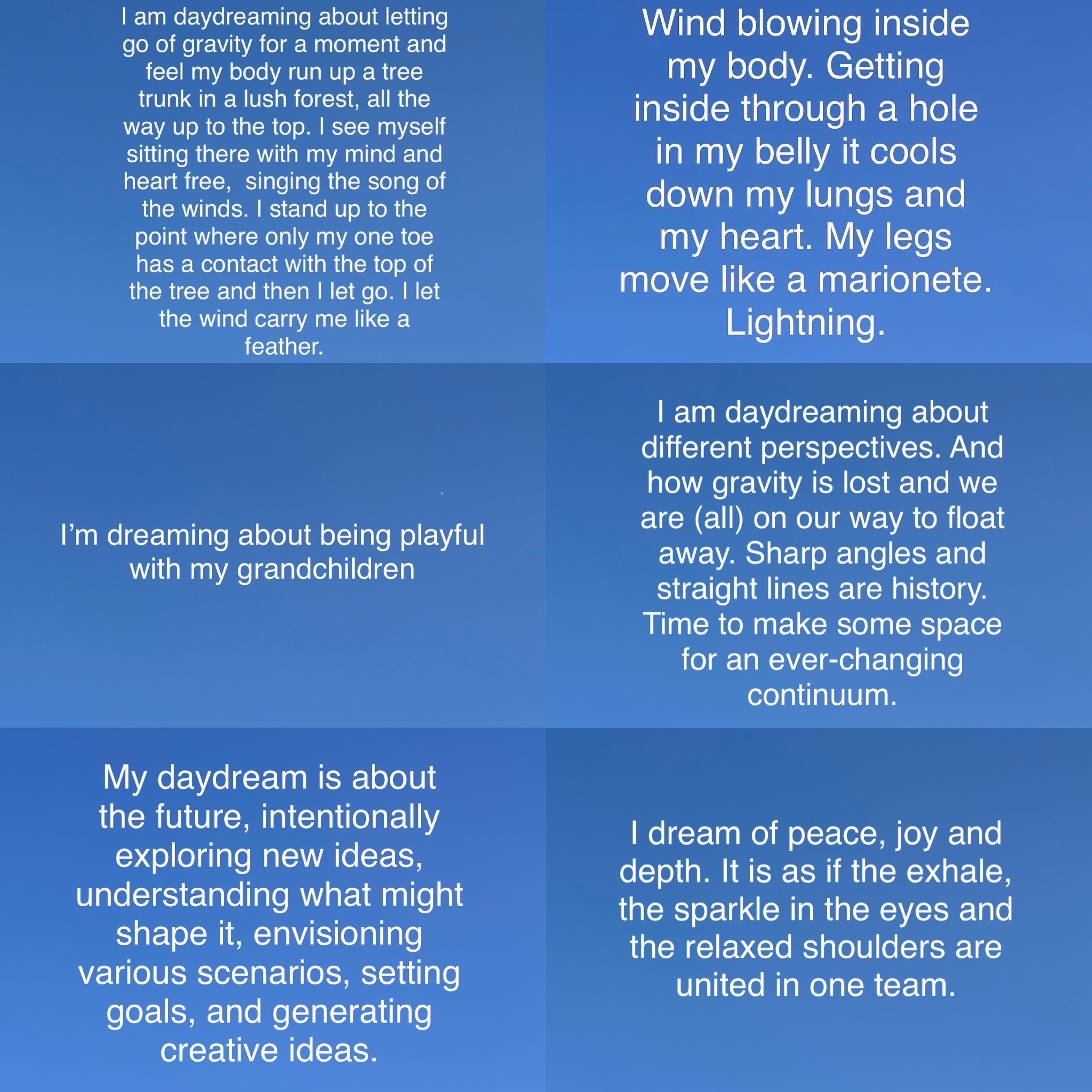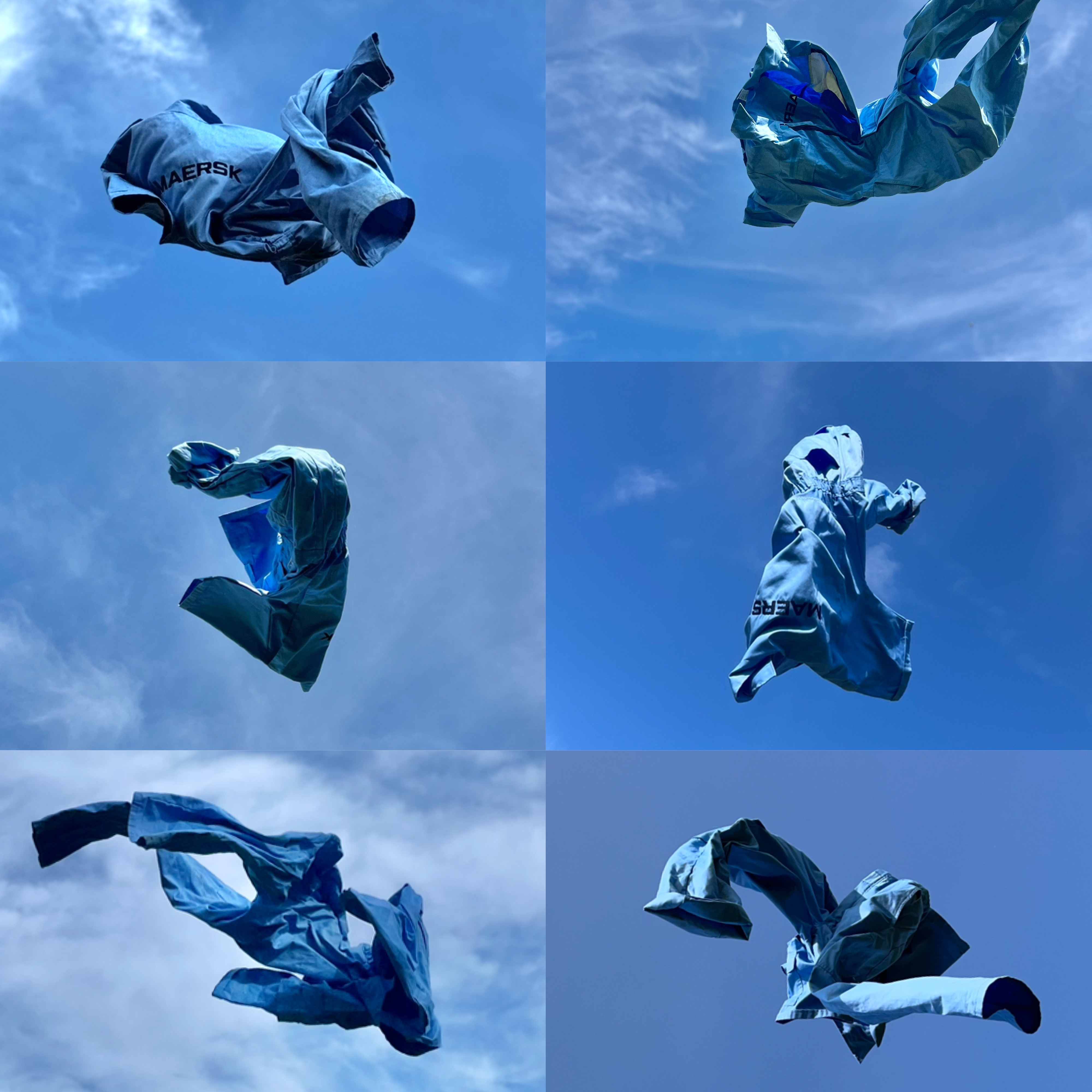 Then I invited others to ask themselves “What am I daydreaming about?”, throw a jumpsuit in the sky and take a picture of it with just the sky in the background; take as many pictures as they need to capture the shape that matches their answer to the question.