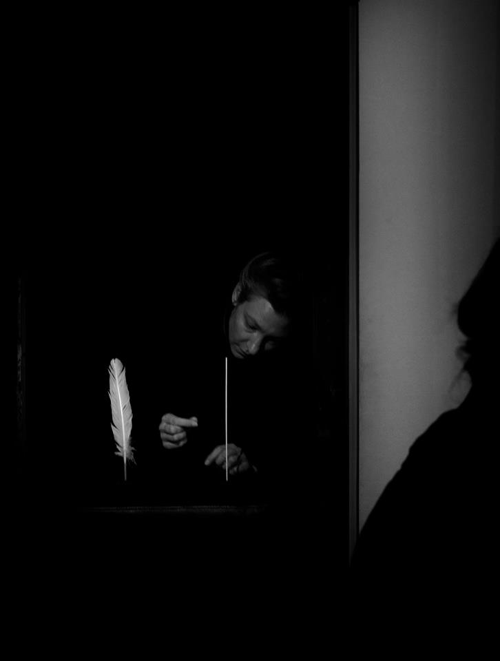I sit in the closet, slowly and meticulously detaching hair by hair from the feather and gluing it to a white stick processing the difference between the beginning and the end of time.